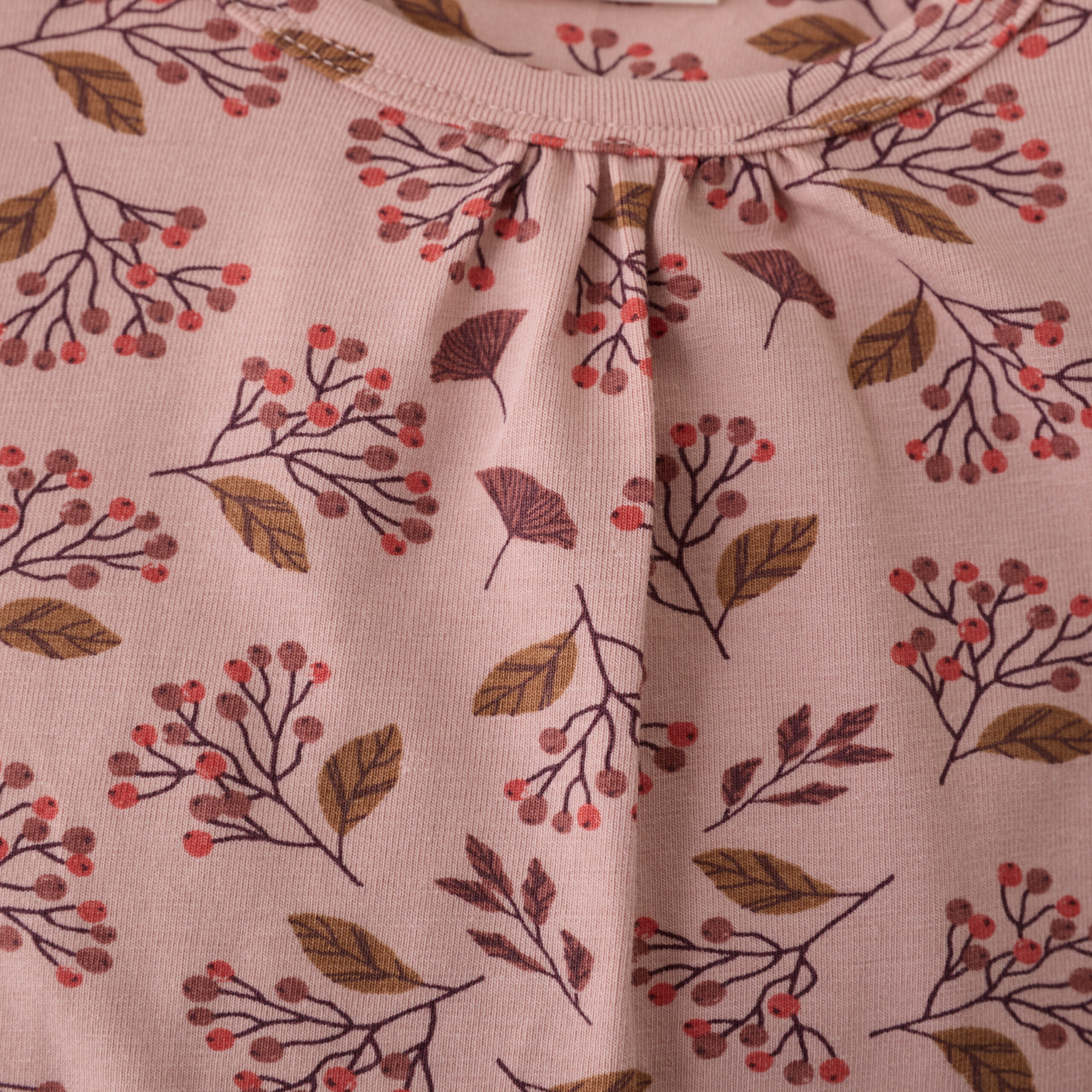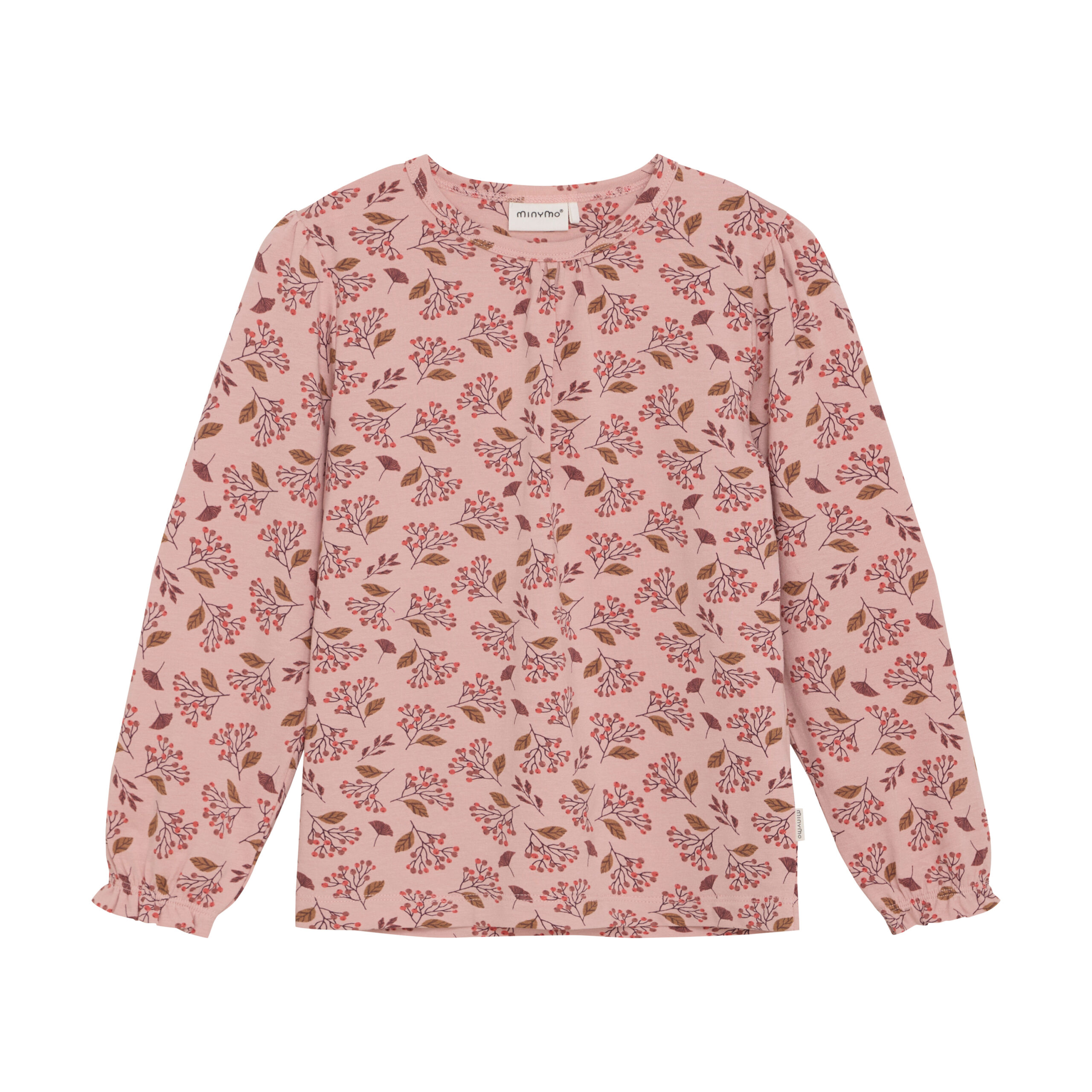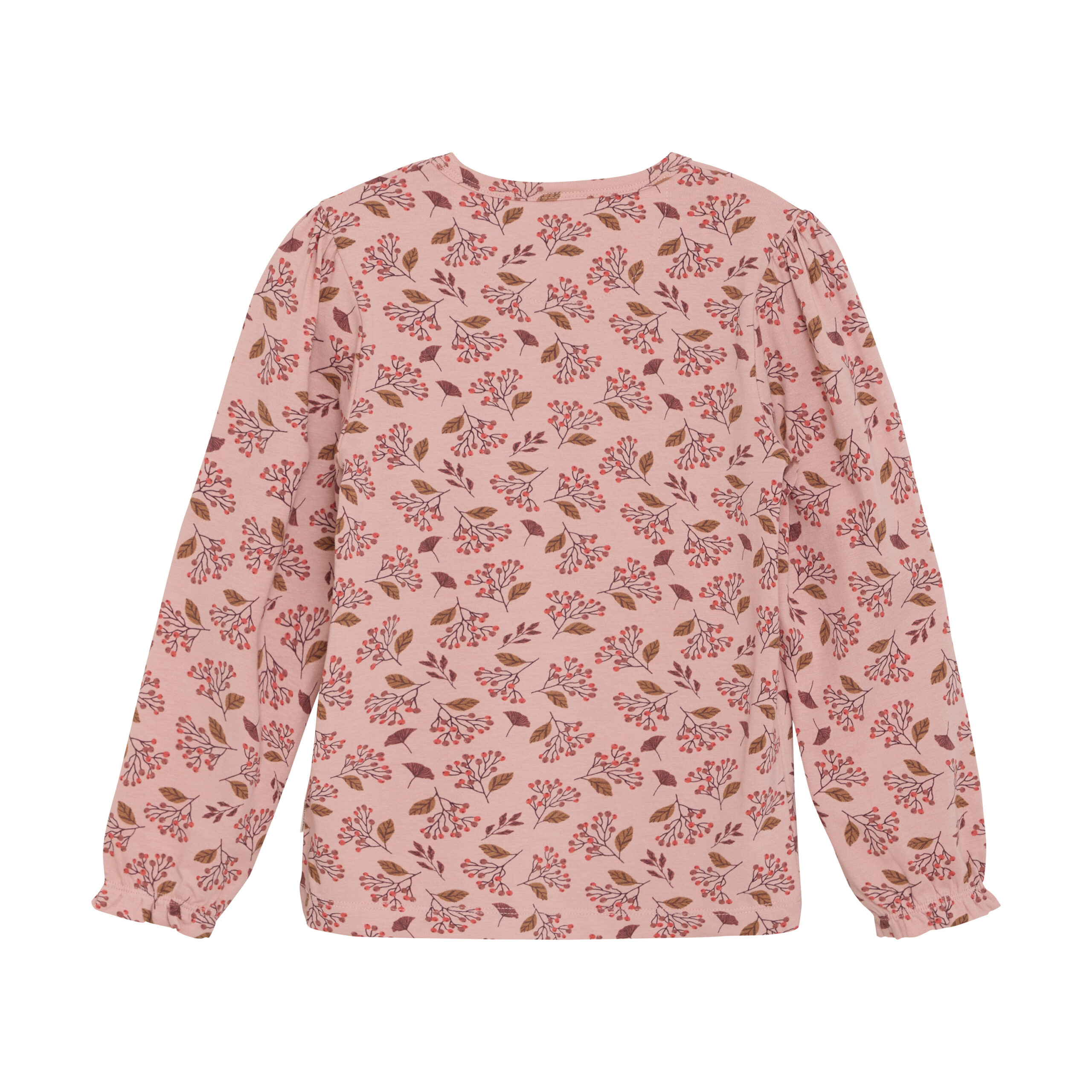 48% Modal/ 48% Cotton/ 4% Elastane – 124042 5240 – Mädchen – Minymo – T-shirt LS AOP, Misty Rose – Langarm-T-Shirt mit Allover-Print und feinen Rüschen-Details an den Bündchen, die einen femininen Touch verleihen. – Wash 40deg – No bleaching – – Tumble dry low heat – Iron low temperature – Do not dry clean –